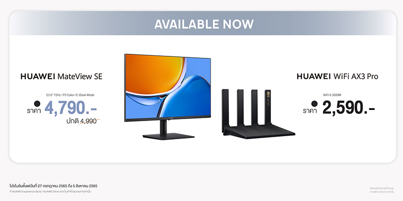 นอกจากนี้ หัวเว่ยยังเปิดตัวจอมอนิเตอร์ HUAWEI MateView SE ราคาพิเศษ 4,790 บาท จากราคาปกติ 4,990 บาท และเราเตอร์ HUAWEI WiFi AX3 Pro ในราคา 2,590 บาทพร้อมวางจำหน่ายแล้ววันนี้ เติมเต็มอีโคซิสเต็มเพื่อการทำงานร่วมกันอย่างมีประสิทธิภาพและการเชื่อมต่อที่ครอบคลุมแบบครบวงจร โดยสามารถศึกษารายละเอียดเพิ่มเติมเกี่ยวกับสินค้าที่เปิดตัวภายในงาน HUAWEI APAC Smart Office Launch 2022 ได้ที่นี่