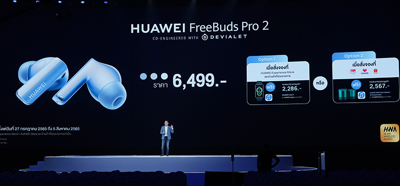 HUAWEI FreeBuds Pro 2 วางจำหน่ายในประเทศไทย ราคาเพียง 6,499 บาท พิเศษช่วงพรีออเดอร์ระหว่างวันที่ 27 กรกฎาคม 2565 ถึง 5 สิงหาคม 2565 เมื่อสั่งจองได้ที่หน้าร้าน HUAWEI Experience Store และร้านค้าที่ร่วมรายการรับฟรี! HUAWEI Band 6 มูลค่า 1,899 บาท และ HUAWEI Music Premium ฟรี 3 เดือน มูลค่า 387 บาท และเมื่อสั่งจองที่ช่องทางออนไลน์ HUAWEI Store และร้านค้าอย่างเป็นทางการของหัวเว่ยบน Shopee และ Lazada รับฟรี HUAWEI Mini Speaker มูลค่า 2,180 บาท และ HUAWEI Music Premium ฟรี 3 เดือน มูลค่า 387 บาท