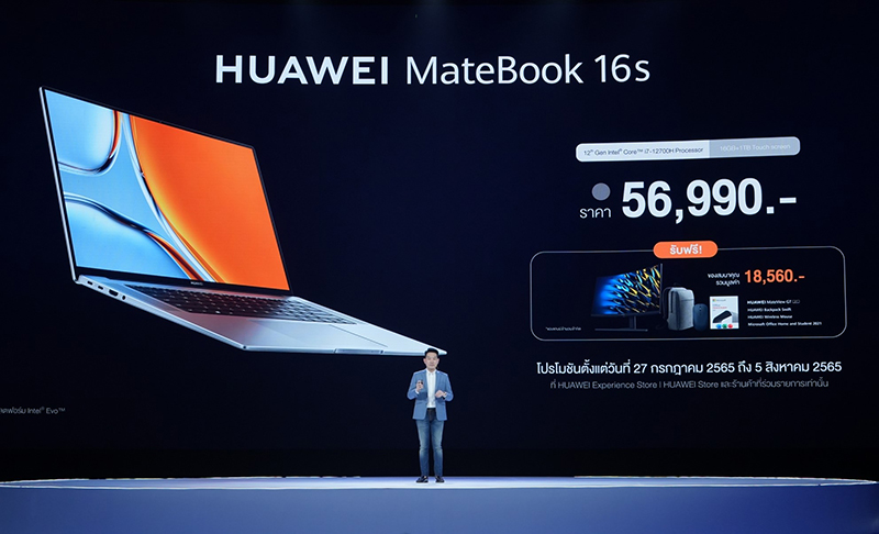 โดย HUAWEI MateBook 16s รุ่น12th Gen Intel Core i7-12700H processor วางจำหน่ายในประเทศไทยที่ราคา 56,990 บาท พิเศษโปรโมชันพรีออเดอร์ระหว่างวันที่ 27 กรกฎาคม – 5 สิงหาคม 2565 รับฟรี! ของสมนาคุณมูลค่ารวม 18,560 บาท ได้แก่ HUAWEI MateView GT (ขนาด 27 นิ้ว) มูลค่า 12,990 บาท Microsoft Office Home & Student 2021 (เวอร์ชันใช้งานตลอดชีพ) มูลค่า 3,390 บาท HUAWEI Wireless Mouse สีน้ำเงิน มูลค่า 1,090 บาท และ HUAWEI Backpack Swift มูลค่า 1,090 บาท โดยสามารถสั่งจองได้ที่หน้าร้าน HUAWEI Experience Store และร้านค้าที่ร่วมรายการ รวมถึงช่องทางออนไลน์ HUAWEI Store และร้านค้าอย่างเป็นทางการของหัวเว่ยบน JD Central, Shopee, Lazada