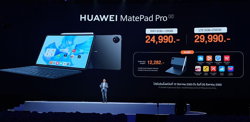โดย HUAWEI MatePad Pro 11-inch เตรียมวางจำหน่ายในประเทศไทย 2 รุ่นเร็วๆ นี้ โดย รุ่น WIFI (8GB + 128GB) ราคา 24,990 บาทและรุ่น LTE (8GB + 256GB) ราคา 29,990 บาท พิเศษโปรโมชันพรีออเดอร์ระหว่างวันที่ 12 – 26 สิงหาคม 2565 รับฟรี! HUAWEI Smart Magnetic Keyboard, M-pencil 2nd generation และของสมนาคุณอื่นๆ มูลค่ารวม 12,282 บาท พิเศษมากขึ้นเมื่อลงทะเบียนล่วงหน้าสำเร็จบนเว็บไซต์ HUAWEI Store ระหว่างวันที่ 27 กรกฎาคม – 11 สิงหาคม 2565 รับฟรี! กล่องของขวัญ City Travel Gift Package 2 มูลค่า 1,690 บาท ลงทะเบียนล่วงหน้าได้ที่ HUAWEI Store