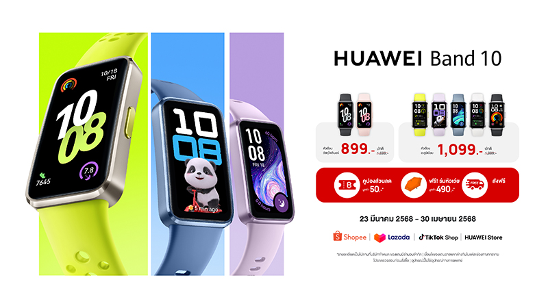 - HUAWEI Band 10 วัสดุโพลีเมอร์ ทนทาน มีให้เลือก 2 สี: ดำ และ ชมพู วางจำหน่ายในพิเศษเหลือเพียง 899 บาท จากราคาปกติ 1,699 บาท เมื่อสั่งซื้อในช่วงโปรโมชัน Early Bird ตั้งแต่ 23 มีนาคม – 30 เมษายน 2568