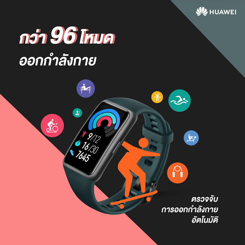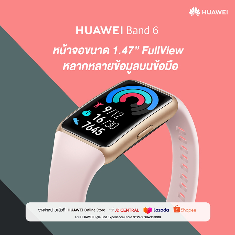 หัวเว่ย คอนซูมเมอร์ บิสสิเนส กรุ๊ป (ประเทศไทย) เปิดตัว HUAWEI Band 6 ผลิตภัณฑ์น้องใหม่ล่าสุดในกลุ่มสมาร์ทแบนด์จากหัวเว่ยที่มาพร้อมกับความชัดเต็มตาแบบ FullView และความสะดวกสบายในการใช้งานกับหน้าจอที่ใหญ่ถึง 1.47 นิ้ว คล้ายคลึงกับหน้าจอของสมาร์ทวอทช์ การใช้ชีวิตแบบไม่มีสะดุดกับแบตเตอรี่ที่ใช้งานได้ต่อเนื่องยาวนานถึง 14 วัน และประสิทธิภาพที่รังสรรค์ขึ้นมาอย่างพิถีพิถันเพื่อแอคทีฟไลฟ์สไตล์และการดูแลสุขภาพอย่างเหนือชั้นกับฟีเจอร์ออกกำลังกายที่ให้มาแบบจัดเต็มถึง 96 โหมด ดีไซน์โมเดิร์นโฉบเฉี่ยวสะดุดตาและวัสดุคุณภาพระดับพรีเมียม เหมาะสำหรับการสวมใส่ได้ทุกโอกาส วางจำหน่ายอย่างเป็นทางการในประเทศไทยตั้งแต่วันที่ 26 พฤษภาคม 2564 นี้เป็นต้นไป โดยมีให้เลือกถึง 3 สี ได้แก่ Graphite Black, Forest Green และ Sakura Pink ในราคาจับต้องได้เพียง 1,899 บาท