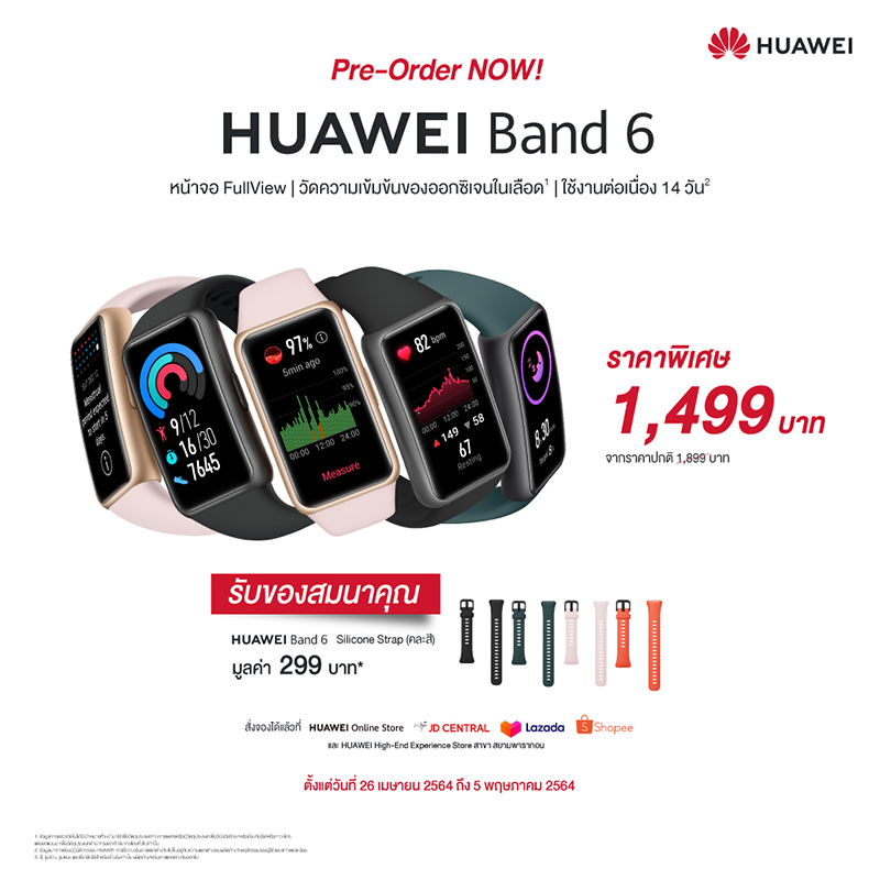 โดยผู้ที่สนใจสามารถเป็นเจ้าของ HUAWEI Band 6 ได้ง่ายยิ่งขึ้นด้วยข้อเสนอสุดคุ้มในช่วงพรีออร์เดอร์ที่มอบราคาลดพิเศษเหลือ 1,499 บาท พร้อมรับฟรี HUAWEI Band 6 Silicone Strap มูลค่า 299 บาท เมื่อสั่งจองตั้งแต่วันที่ 26 เมษายน – 5 พฤษภาคม 2564 นี้ ผ่านช่องทางออนไลน์ทั้ง HUAWEI Online Store, JD Central, Lazada, Shopee และที่ HUAWEI High-End Experience Store สาขาสยามพารากอน