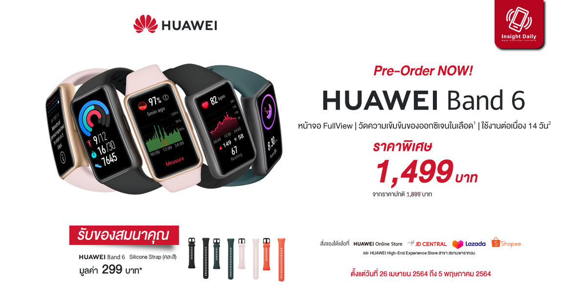 โดยผู้ที่สนใจสามารถเป็นเจ้าของ HUAWEI Band 6 ได้ง่ายยิ่งขึ้นด้วยข้อเสนอสุดคุ้มในช่วงพรีออร์เดอร์ที่มอบราคาลดพิเศษเหลือ 1,499 บาท พร้อมรับฟรี HUAWEI Band 6 Silicone Strap มูลค่า 299 บาท เมื่อสั่งจองตั้งแต่วันที่ 26 เมษายน – 5 พฤษภาคม 2564 นี้ ผ่านช่องทางออนไลน์ทั้ง HUAWEI Online Store, JD Central, Lazada, Shopee และที่ HUAWEI High-End Experience Store สาขาสยามพารากอน