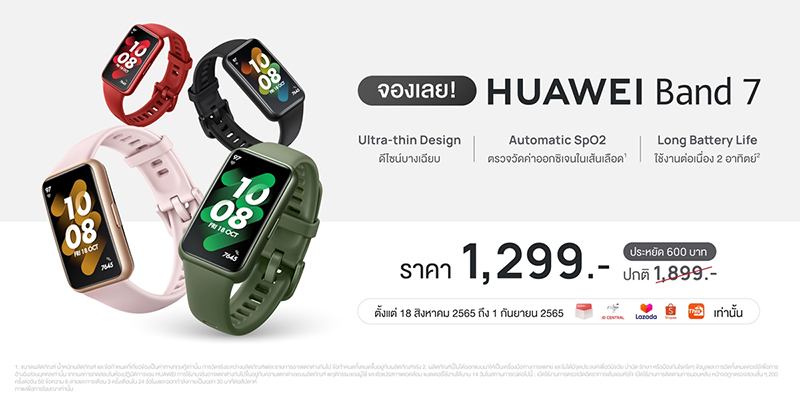 ปักหมุดแจ้งเตือนไว้เลยกับการเปิดตัว HUAWEI Band 7 ที่จะเข้ามาฉีกภาพลักษณ์และข้อจำกัดต่างๆ ของสมาร์ทแบนด์แบบเดิมๆ ด้วยดีไซน์โฉบเฉี่ยวแบบสมาร์ทวอทช์แต่บางเบาคล่องตัว อัดแน่นด้วยฟีเจอร์ด้านสุขภาพแบบครบครัน พร้อมเป็นผู้ช่วยอัจฉริยะที่จะคอยดูแลสุขภาพของคุณตลอด 24 ชม. โดย HUAWEI Band 7 จะมีจำหน่ายในประเทศไทยทั้งหมด 4 สีที่เข้ากับทุกลุค ได้แก่ Graphite Black, Nebula Pink, Wilderness Green และ Flame Red ในราคาเพียงแค่ 1,899 บาทเท่านั้น! และเมื่อพรีออเดอร์ HUAWEI Band 7 ตั้งแต่วันที่ 18 สิงหาคม – 1 กันยายน 2565 นี้ รับไปเลยราคาสุดคุ้ม เหลือเพียงแค่ 1,299 บาท! โดยจะมีการจำหน่ายผ่านช่องทางออนไลน์เท่านั้นที่ HUAWEI Online Store และร้านค้าออนไลน์อย่างเป็นทางการของหัวเว่ยบนช่องทาง Shopee, Lazada, JD Central และ Thisshop