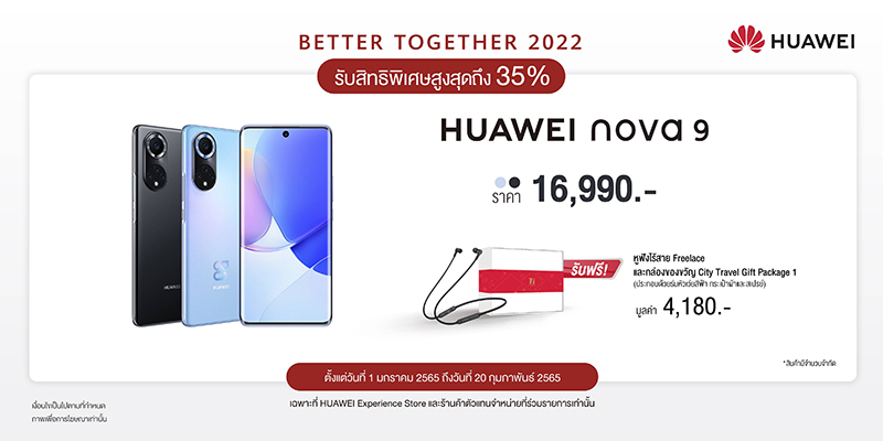 เป็นเจ้าของ HUAWEI nova 9 สมาร์ทโฟนที่ตอบโจทย์ชีวิตสมาร์ทของสาย on-the-move ที่ต้องทำงานผ่านสมาร์ทโฟนเป็นประจำ มาพร้อมกล้องโปรระดับเรือธงที่อัดแน่นด้วยเทคโนโลยีการถ่ายภาพอย่างกล้อง Super Sensing 50MP Ultra Vision AI Quad Camera จอ 120 Hz และรองรับการชาร์จไว 66W HUAWEI SuperCharge มาในสี Starry Blue และ Black ให้เลือกสองสี ราคา 16,990 บาท รับหูฟังไร้สาย Freelace และกล่องของขวัญ City Travel Gift Package 1 (ร่มหัวเว่ยสีฟ้า กระเป๋าผ้า และสเปรย์) รวมมูลค่า 4,180 บาท