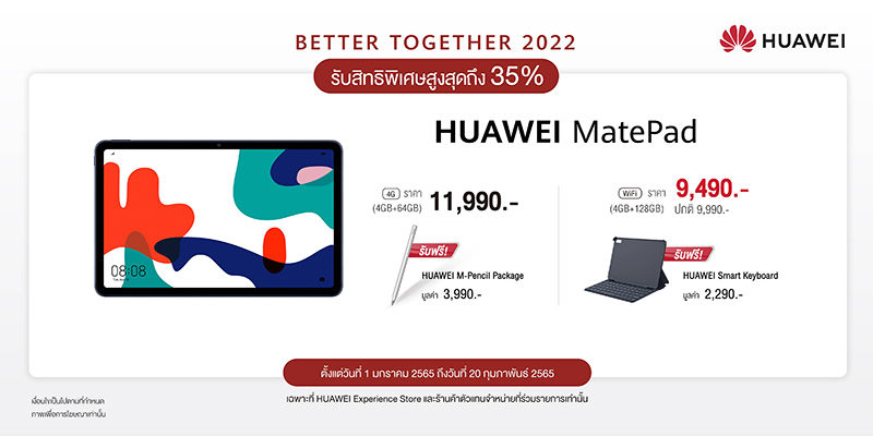 หัวเว่ย คอนซูมเมอร์ บิสสิเนส กรุ๊ป (ประเทศไทย) ส่งความสุขต้อนรับปีเสือให้ลูกค้าได้จุใจแบบไม่อั้น จัดแคมเปญ BETTER TOGETHER 2022 มอบข้อเสนอพิเศษมากมายเพื่อการใช้ชีวิตแบบอัจฉริยะ ตอบโจทย์ได้อย่างครบเครื่องทั้งเรื่องงานและการดูแลรักษาสุขภาพแบบล้ำๆ ในยุคดิจิทัล กับส่วนลดสูงสุดถึง 35% พร้อมของสมนาคุณแบบจัดเต็มสำหรับสินค้าไอทีมากมายจากหลากหลายกลุ่มผลิตภัณฑ์ ใครที่อยากเริ่มต้นปีแบบมีชัยไปแล้วกว่าครึ่ง บอกเลยว่าห้ามพลาดเพราะข้อเสนอดีๆ แบบนี้มีระยะเวลาจำกัด เฉพาะวันที่ 1 มกราคม 2565 ถึง 20 กุมภาพันธ์ 2565 เมื่อซื้อสินค้าที่ HUAWEI Experience Store และ ร้านค้าตัวแทนจำหน่ายที่ร่วมรายการเท่านั้น