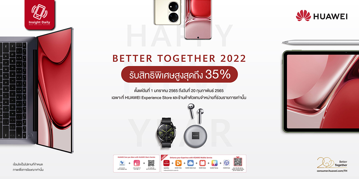 หัวเว่ย คอนซูมเมอร์ บิสสิเนส กรุ๊ป (ประเทศไทย) ส่งความสุขต้อนรับปีเสือให้ลูกค้าได้จุใจแบบไม่อั้น จัดแคมเปญ BETTER TOGETHER 2022 มอบข้อเสนอพิเศษมากมายเพื่อการใช้ชีวิตแบบอัจฉริยะ ตอบโจทย์ได้อย่างครบเครื่องทั้งเรื่องงานและการดูแลรักษาสุขภาพแบบล้ำๆ ในยุคดิจิทัล กับส่วนลดสูงสุดถึง 35% พร้อมของสมนาคุณแบบจัดเต็มสำหรับสินค้าไอทีมากมายจากหลากหลายกลุ่มผลิตภัณฑ์ ใครที่อยากเริ่มต้นปีแบบมีชัยไปแล้วกว่าครึ่ง บอกเลยว่าห้ามพลาดเพราะข้อเสนอดีๆ แบบนี้มีระยะเวลาจำกัด เฉพาะวันที่ 1 มกราคม 2565 ถึง 20 กุมภาพันธ์ 2565 เมื่อซื้อสินค้าที่ HUAWEI Experience Store และ ร้านค้าตัวแทนจำหน่ายที่ร่วมรายการเท่านั้น