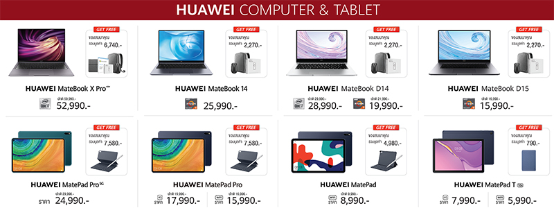 | แล็ปท็อป | HUAWEI MateBook X Pro (i7) | *52,990 บาท | Microsoft office 365, ซองใส่แล็ปท็อป, Mate Dock, HUAWEI Laptop Bag และ HUAWEI Mouse และ USB Flash Drive มูลค่ารวม 6,740 บาท |