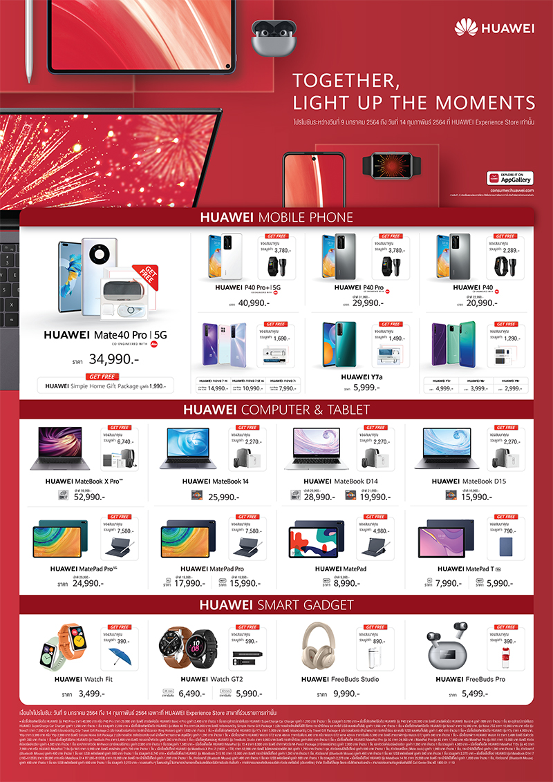 | สมาร์ทโฟน | HUAWEI Mate 40 Pro | 34,990 บาท | HUAWEI Simple Home Gift Package 1 (ประกอบด้วย โคมไฟตั้งโต๊ะไร้สาย กระเป๋าใส่ของ และเคสใส่ USB แบบพับเก็บได้) มูลค่ารวม 1,990 บาท |