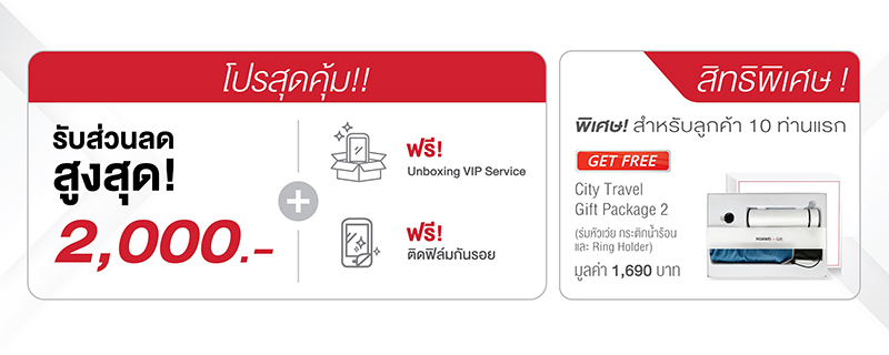 ความคุ้มค่าของการ Click & Collect ไม่ได้หมดเพียงเท่านี้ เพราะหัวเว่ยยังมีกิจกรรมแจกชุดของสมนาคุณสุดพิเศษสำหรับลูกค้า 10 ท่านแรกที่จองสินค้าราคาพิเศษข้างต้นผ่าน HUAWEI Online Store ตั้งแต่วันที่ 23 – 28 กุมภาพันธ์ 2564 และชำระเงินพร้อมรับสินค้าหน้าร้าน HUAWEI Experience Store สาขาที่ร่วมรายการ ตั้งแต่วันที่ 26 – 28 กุมภาพันธ์ 2564 รับไปเลยทันที HUAWEI City Travel Gift Package 2 มูลค่ารวม 1,690 บาท ที่รวมไอเทมสารพัดประโยชน์อย่าง ร่มหัวเว่ย กระติกน้ำร้อน และ Ring Holder จำนวนจำกัดเพียงสาขาละ 10 ชุด เท่านั้น