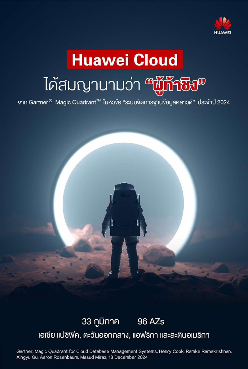 หัวเว่ย คลาวด์ (Huawei Cloud) ได้รับการจัดอันดับเป็น “ผู้ท้าชิง” (Challenger) ในรายงาน Gartner® Magic Quadrant™ สำหรับ Cloud Database Management Systems (DBMS) ประจำปี 2024 ซึ่งการจัดอันดับนี้เผยแพร่โดย Gartner สถาบันวิจัยชั้นนำระดับโลกที่ได้รับการยอมรับในวงกว้าง
