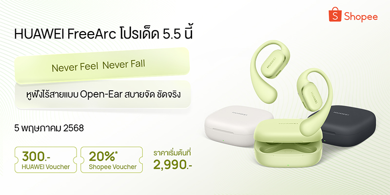 แคมเปญ Shopee 5.5 ปีนี้ต้องจับตา! HUAWEI FreeArc หูฟังไร้สายดีไซน์ใหม่จากหัวเว่ยมาแรงสุดในหมวดแกดเจ็ต ด้วยราคาพิเศษเหลือเพียง 2,990 บาท พร้อมดีลสุดคุ้ม ลดทันที 2 ต่อ เอาใจคนรักแกดเจ็ตโดยเฉพาะ
