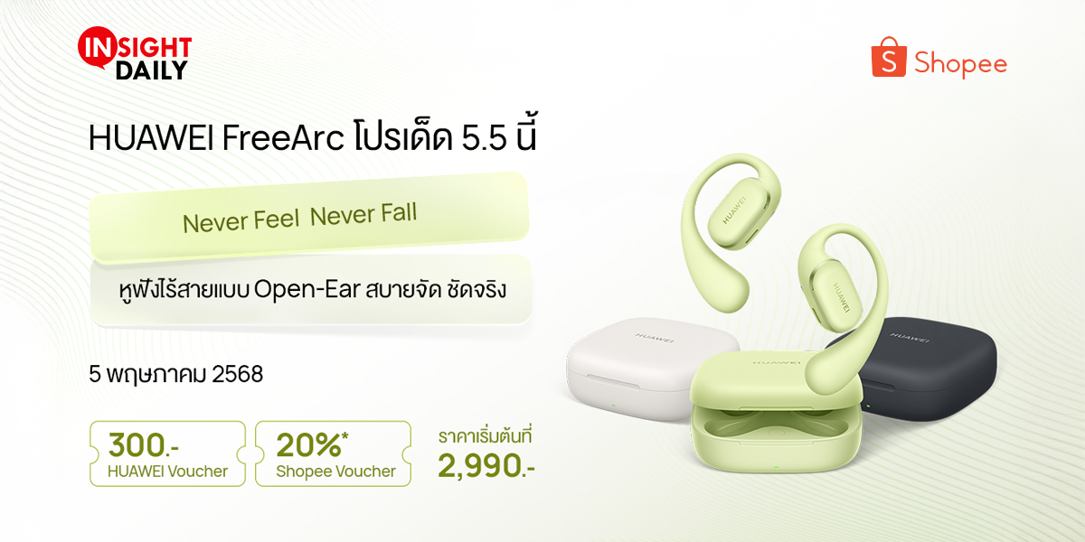 แคมเปญ Shopee 5.5 ปีนี้ต้องจับตา! HUAWEI FreeArc หูฟังไร้สายดีไซน์ใหม่จากหัวเว่ยมาแรงสุดในหมวดแกดเจ็ต ด้วยราคาพิเศษเหลือเพียง 2,990 บาท พร้อมดีลสุดคุ้ม ลดทันที 2 ต่อ เอาใจคนรักแกดเจ็ตโดยเฉพาะ