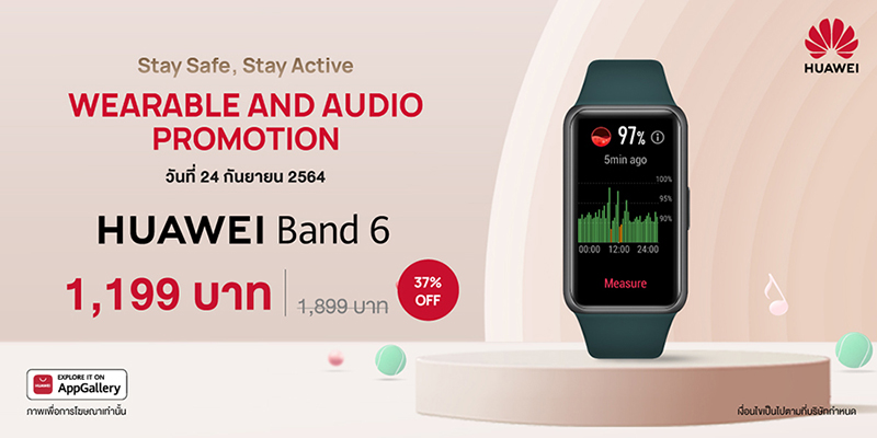 - HUAWEI Band 6 สมาร์ทแบนด์ที่มาพร้อมหน้าจอขนาดใหญ่ 47 นิ้ว ชัดเต็มตาแบบ FullView ให้ความรู้สึกคล้ายหน้าจอสมาร์ทวอทช์ มาพร้อมโหมดออกกำลังกายที่จัดเต็มถึง 96 โหมด สามารถตรวจวัดอัตราการเต้นของหัวใจขณะออกกำลังกาย และวัดค่าความอิ่มตัวของออกซิเจนในเลือด (SpO2) ของผู้สวมใส่ในระหว่างออกกำลังกายได้ ดีไซน์โมเดิร์นโฉบเฉี่ยวสะดุดตา สวมใส่ได้ทุกโอกาส ใช้งานได้ต่อเนื่องยาวนานถึง 14 วัน ราคาพิเศษเพียง 1,199 บาท จากราคาปกติ 1,899 บาท พร้อมรับฟรีสายนาฬิกามูลค่า 399 บาท เมื่อสั่งซื้อสินค้าออนไลน์ผ่านทาง HUAWEI Store และร้านค้าอย่างเป็นทางการของหัวเว่ยบน Shopee และ Lazada ในวันที่ 24 กันยายน 2564