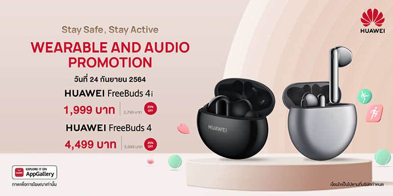 - HUAWEI FreeBuds 4i หูฟังไร้สาย TWS ที่จะยกระดับประสบกาณ์การฟังที่ดียิ่งกว่า กับคุณภาพเสียงคมชัดผ่านไดนามิกไดรเวอร์ขนาดใหญ่ 10 มิลลิเมตร และเทคโนโลยีตัดเสียงรบกวนรอบข้าง (ANC) ซึ่งทำงานร่วมกับ AI ช่วยให้ไมโครโฟนรับเสียงและแยกแยะเสียงได้แม่นยำยิ่งขึ้นและคมชัด รวมทั้งยังได้รับการออกแบบมาให้สามารถลดเสียงรบกวนจากลมที่มาปะทะกับไมโครโฟนได้อย่างมีประสิทธิภาพ พร้อมใช้งานต่อเนื่องนานสูงสุด 10 ชั่วโมง ราคาพิเศษเพียง 1,999 บาท จากราคาปกติ 2,799 บาท พร้อมรับฟรีเคสซิลิโคนสำหรับ FreeBuds 4i มูลค่า 499 บาท เมื่อสั่งซื้อสินค้าผ่านเว็บไซต์ HUAWEI Store ตั้งแต่วันที่ 24 – 30 กันยายน 2564 และสั่งซื้อผ่านร้านค้าอย่างเป็นทางการของหัวเว่ยบน Shopee และ Lazada ระหว่างวันที่ 24 – 28 กันยายน 2564