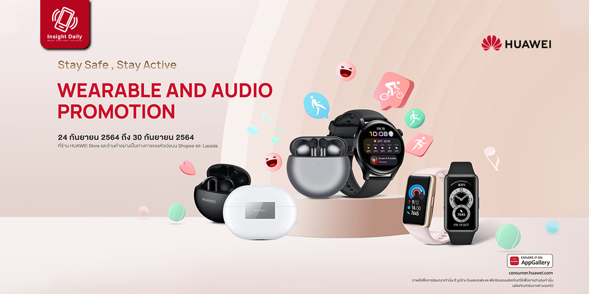 หัวเว่ย คอนซูมเมอร์ บิสสิเนส กรุ๊ป (ประเทศไทย) ขานรับเทรนด์ดูแลสุขภาพเอาใจสายแอคทีฟช่วง Work from Home ให้ยังฟิตแอนด์เฟิร์มได้ทั้งกายใจ จัดโปรโมชันสุดคุ้มสำหรับสมาร์ทดีไวซ์กลุ่ม wearable โดยเฉพาะ กับแคมเปญ “Stay Safe, Stay Active” เมื่อสั่งซื้อสินค้าผ่านเว็บไซต์ HUAWEI Store ตั้งแต่วันที่ 24 – 30 กันยายน 2564 และสั่งซื้อผ่านร้านค้าอย่างเป็นทางการของหัวเว่ยบน Shopee และ Lazada ระหว่างวันที่ 24 – 28 กันยายน 2564