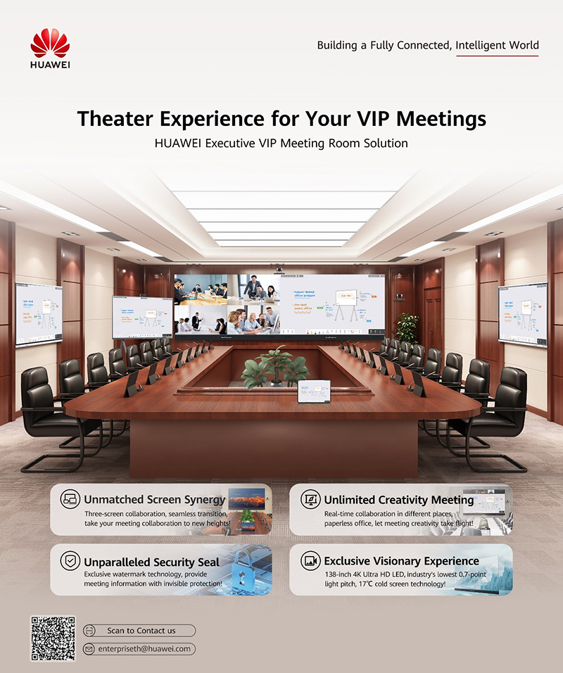 โดยโซลูชันห้องประชุมวีไอพีของหัวเว่ยคือ โซลูชันที่ออกแบบมาเพื่อยกระดับประสบการณ์การประชุมที่สําคัญ ตอบโจทย์ความต้องการที่เหนือระดับ เพื่อให้มั่นใจว่าการสนทนาจะดําเนินไปในสภาพแวดล้อมที่ปลอดภัย สะดวกสบาย และเป็นมืออาชีพ ซึ่งภายในห้องประชุมมีอุปกรณ์ภาพและเสียงรุ่นล่าสุด เช่น IdeaPresence ขนาด 138 นิ้ว, IdeaHub ขนาดต่างๆ และอุปกรณ์การประชุมผ่านวิดีโอ เพื่อมอบประสบการณ์เสมือนจริงสําหรับการประชุมที่สําคัญขององค์กร