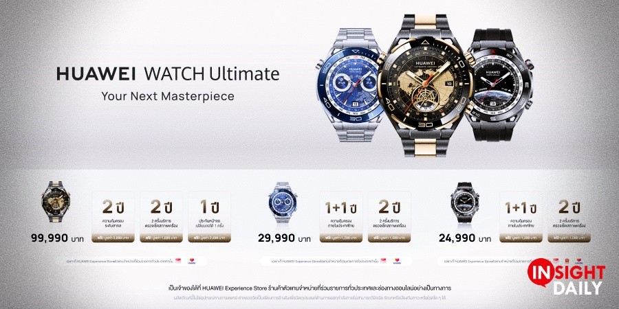 - HUAWEI WATCH Ultimate สี Expedition Black วางจำหน่ายในราคา 24,990 บาท พร้อมรับฟรี! บริการความคุ้มครองระดับสากล 2 ปี มูลค่า 1,299 บาท บริการตรวจเช็คสภาพเครื่อง 2 ครั้งในระยะเวลา 2 ปี มูลค่า 1,099 บาท ที่ HUAWEI Experience Store ร้านค้าตัวแทนจำหน่ายที่ร่วมรายการ และ HUAWEI Store รวมทั้งร้านค้าอย่างเป็นทางการของหัวเว่ยบนแพลตฟอร์มออนไลน์ Lazada และ Shopee