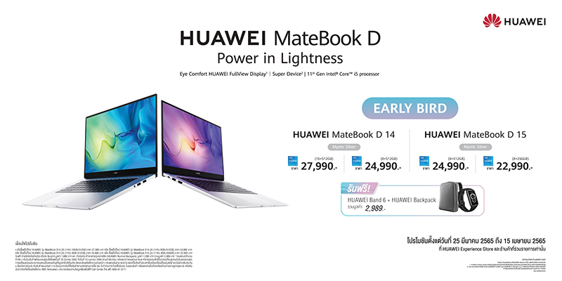 ใครที่มองหาแล็ปท็อปเครื่องแรก หรือต้องการแล็ปท็อปที่สเปกดีและราคาคุ้มแบบครบจบในเครื่องเดียวไว้คู่มือคู่ใจไม่ว่าจะเรียน ทำงาน หรือเพื่อความบันเทิง สามารถเป็นเจ้าของก่อนใครพร้อมโปรโมชันสุดคุ้ม รับฟรีสายรัดข้อมืออัจฉริยะ HUAWEI Band 6 และกระเป๋าสะพาย HUAWEI Backpack มูลค่ารวม 2,989 บาท เมื่อสั่งซื้อสินค้าภายในวันที่ 25 มีนาคม 2565 ถึง 15 เมษายน 2565 ที่ เว็บไซต์ HUAWEI Store ร้านค้าออนไลน์อย่างเป็นทางการของหัวเว่ยบน Shopee, Lazada และ JD Central รวมถึงหน้าร้าน HUAWEI Experience Store และร้านค้าตัวแทนจำหน่ายที่ร่วมรายการ