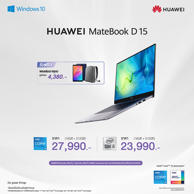 23,900 บาท | 28 เมษายน – 7 พฤษภาคม 2564 สามารถสั่งจองได้ที่นี่ รับฟรีของสมนาคุณมูลค่ารวม 4,380 บาท ประกอบด้วย – HUAWEI MatePad T8 – กระเป๋า HUAWEI Backpack |