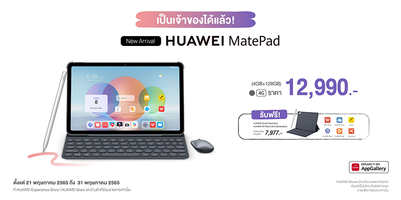 นอกจากประสิทธิภาพและคุณสมบัติของดีไวซ์แล้ว เรื่องของราคาและข้อเสนอก็เป็นสิ่งที่ไม่ควรมองข้าม สำหรับHUAWEI MatePad 10.4-inch 2022 จัดเต็มให้ทั้งซอฟต์แวร์และฮาร์ดแวร์ในราคาที่เหมาะสมพร้อมกับประหยัดเงินซื้ออุปกรณ์เสริมไปในตัว หากใครสนใจอยากได้แท็ปเล็ตสักเครื่องที่ให้ประสบการณ์ไม่ต่างจากการใช้งานพีซีและพร้อมลุยงานไปกับคุณทุกๆ ที่ ก็พลาดไม่ได้ HUAWEI MatePad 10.4-inch 2022 (4GB + 128GB) 4G มาในสี Matte Grey ราคา 12,990 บาท รับฟรี HUAWEI Smart Keyboard (มูลค่า 2,290 บาท) และ HUAWEI M-Pencil Package 2nd generation (มูลค่า 4,490 บาท) พร้อมสิทธิประโยชน์อีกมากมายสำหรับลูกค้า HUAWEI Mobile Service และแอปพลิเคชันต่างๆ (มูลค่ารวม 1,197 บาท) รวมมูลค่าทั้งหมด 7,977 บาท เมื่อซื้อตั้งแต่วันที่ 21 พฤษภาคม 2565 – 31 พฤษภาคม 2565 (ของสมนาคุณมีจำนวนจำกัด) เป็นเจ้าของได้แล้ววันนี้ที่ HUAWEI Experience Store และร้านค้าตัวแทนจำหน่ายที่ร่วมรายการ รวมถึงช่องทางออนไลน์อย่างเว็บไซต์ HUAWEI Store ร้านค้าอย่างเป็นทางการของหัวเว่ยบนแอปพลิเคชัน Shopee, Lazada, JD Central และ Thisshop และแอปพลิเคชัน My HUAWEI