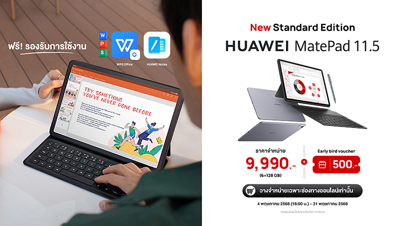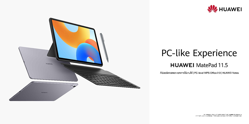 ใหม่! HUAWEI MatePad 11.5” NEW (Standard Edition) แท็บเล็ตที่ออกแบบมาเพื่อตอบโจทย์การทำงานที่ลื่นไหล เสริมประสบการณ์ระดับพีซี ผ่านแอป PC-Level WPS และ HUAWEI Notes พร้อมรองรับอุปกรณ์เสริมที่ช่วยให้ใช้งานได้เต็มประสิทธิภาพยิ่งขึ้นกับ Keyboard และ M-Pen Lite รวมทั้งเมาส์ เพื่อเพิ่มความสะดวกในการพิมพ์และการเขียน พร้อมดาวน์โหลดแอปใช้งานอื่น ๆ เพิ่มเติมได้ผ่าน AppGallery วางจำหน่ายแบบเอ็กซ์คลูซีฟผ่านช่องทางออนไลน์เท่านั้น ตอบโจทย์ไลฟ์สไตล์ยุคใหม่ที่นิยมซื้อสินค้าออนไลน์ และต้องการความสะดวกสบายในการเข้าถึงอุปกรณ์เทคโนโลยี