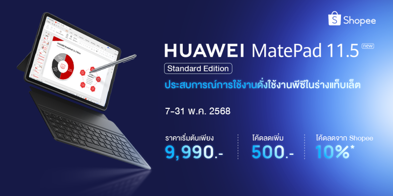 นอกจากความครบเครื่องในตัวเครื่องแล้ว ยังจัดเต็มโปรโมชันสุดพิเศษบน Shopee ให้สายช้อปออนไลน์ได้เป็นเจ้าของ HUAWEI MatePad 11.5” New (Standard Edition) ในราคาสุดคุ้ม พร้อมของแถมหรือสิทธิพิเศษอีกเพียบ เมื่อสั่งซื้อตั้งแต่ 7 พฤษภาคมนี้ เริ่มต้นแค่ 9,990 บาท ได้ของแถมจัดเต็มเกินคุ้ม! รับฟรี คีย์บอร์ด HUAWEI Smart Keyboard ปากกา HUAWEI M-Pen Lite และสิทธิ์ใช้งานแอป PC-Level WPS Office รวมมูลค่ากว่า 10,979 บาท นอกจากนี้เพียงใส่โค้ดจากหัวเว่ย “HUAW115SE” ลดเพิ่มทันที 500 บาท และยังโค้ดจาก Shopee ลดเพิ่มอีกกว่า 10% [1] งานนี้ใครมองหาแท็บเล็ต คุ้ม ครบ ห้ามพลาด!