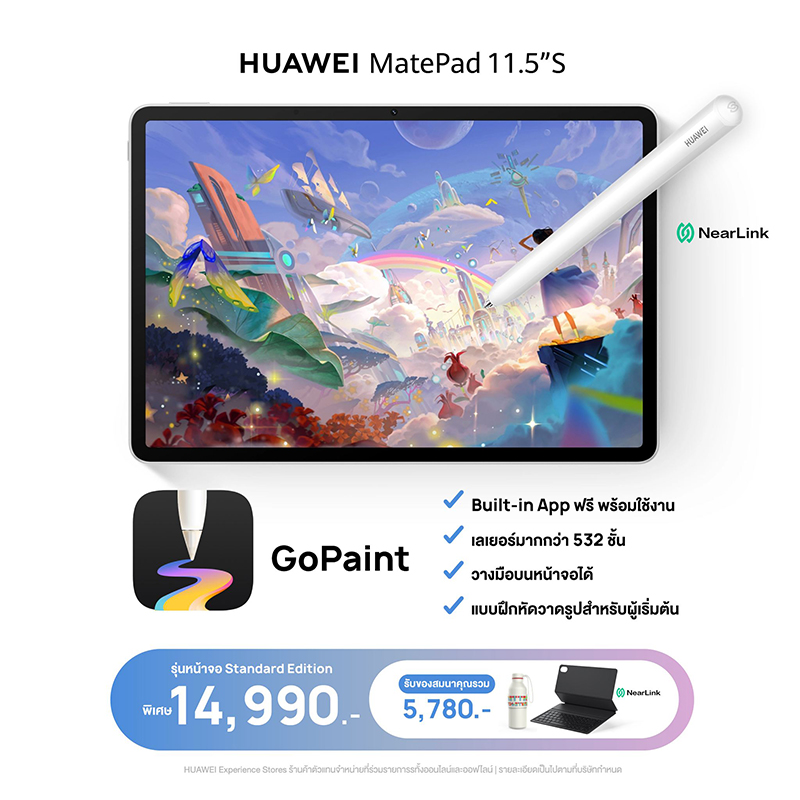GoPaint ผสมผสานซอฟต์แวร์และฮาร์ดแวร์เข้าด้วยกันเพื่อมอบพื้นที่สําหรับการสร้างสรรค์บนแท็บเล็ต HUAWEI MatePad 11.5”S ร่วมกับปากา HUAWEI M-Pencil (รุ่นที่ 3) ที่มีระดับการรับรู้แรงกดมากกว่า 10,000 กำหนดน้ำหนักที่ต้องการได้ง่ายขึ้น มอบประสบการณ์การลงสีที่มีความแม่นยําสูงในระดับพิกเซล ตอบสนองได้ดี และละเอียด ยังมาพร้อมกับหัวแปรงมากกว่า 100 แบบ [1] ตอบโจทย์การวาดภาพได้หลากหลายสไตล์