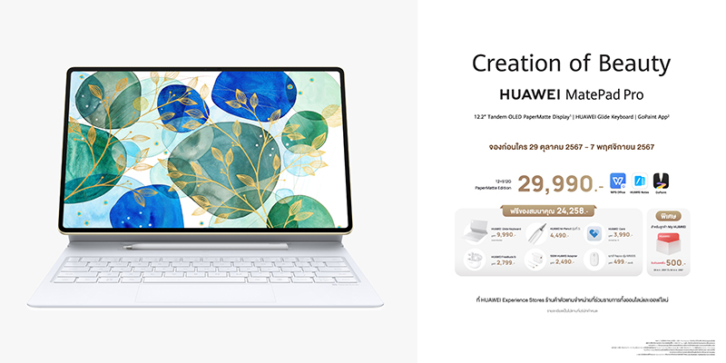 พรีออเดอร์ได้แล้ววันนี้ HUAWEI MatePad Pro 12.2 ในราคาเพียง 29,990 บาท ตั้งแต่วันที่ 29 ตุลาคม 2567 – 7 พฤศจิกายน 2567 รับฟรีทันทีของสมนาคุณมูลค่าสูงสุด 24,258 บาท ได้แก่ HUAWEI Glide Keyboard มูลค่า 9,990 บาท HUAWEI M-Pencil รุ่นที่ 3 มูลค่า 4,490 บาท HUAWEI Care ดูแลหน้าจอ มูลค่า 3,990 บาท 100W HUAWEI Adapter มูลค่า 2,490 บาท HUAWEI FreeBuds 5i มูลค่า 2,799 บาท และ เมาส์ Rapoo รุ่น M650S มูลค่า 499 บาท ที่ HUAWEI Experience Store และร้านค้าที่ร่วมรายการ รวมทั้งช่องทางออนไลน์ HUAWEI Store และร้านค้าอย่างเป็นทางการของหัวเว่ยบนแพลตฟอร์ม Lazada, Shopee และ TikTok Shop