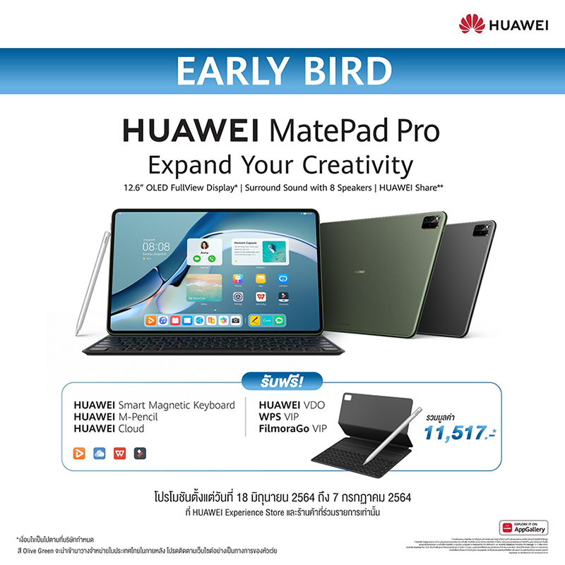 HUAWEI MatePad Pro 12.6-inch วางจำหน่ายแล้วในสี Matte Grey ราคา 28,990 บาท ออกสตาร์ทก่อน ได้เปรียบกว่า! เพราะเมื่อซื้อตั้งแต่วันที่ 18 มิถุนายน – 7 กรกฎาคม 2564 รับฟรีทันที HUAWEI Smart Magnetic Keyboard, HUAWEI M-Pencil, HUAWEI Cloud (200GB ระยะเวลา 3 เดือน), HUAWEI VDO (ระยะเวลา 1 เดือน), WPS VIP (ระยะเวลา 3 เดือน) และ FilmoraGo VIP (ระยะเวลา 3 เดือน) มูลค่ารวม 11,517 บาท ได้ที่ bit.ly/3vqJ0Wj รวมถึง HUAWEI Store, JD Central, Lazada, Shopee, HUAWEI Experience Store, และร้านค้าตัวแทนจำหน่ายอย่างเป็นทางการทั่วประเทศ เห็นของสมนาคุณพิเศษมากมายแบบนี้แล้วห้ามพลาดเด็ดขาด