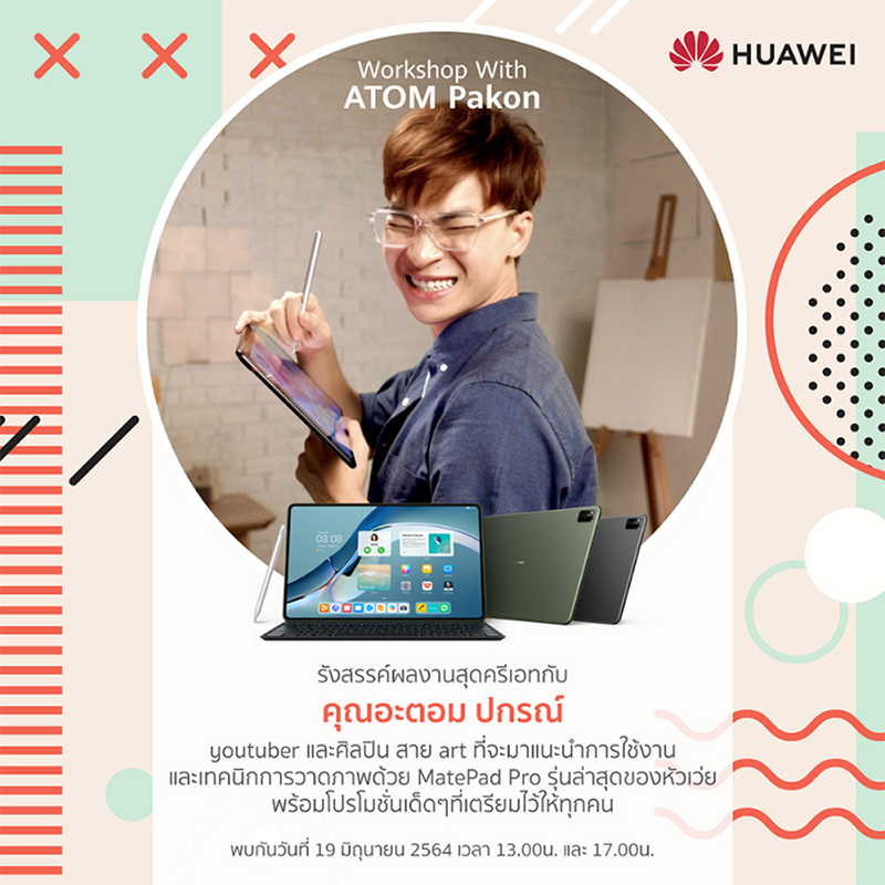 นอกจากนี้ หัวเว่ย คอนซูมเมอร์ บิสสิเนส กรุ๊ป (ประเทศไทย) ยังจัดกิจกรรมสุดเอ็กซ์คลูซีฟ พบกับ คุณอะตอม ปกรณ์ แก้วดี ศิลปิน นักเขียน และ Youtuber สายอาร์ต ที่จะมาแชร์ประสบการณ์และสอนเทคนิคการสร้างสรรค์งานศิลปะด้วย HUAWEI MatePad Pro12.6-inch รุ่นใหม่ล่าสุดจากหัวเว่ย พร้อมกิจกรรมให้ร่วมสนุก และลุ้นรางวัลกันอีกเพียบ ในวันเสาร์ที่ 19 มิถุนายน 2564 เวลา 13.00 น. และ 17.00 น. ณ HUAWEI HIGH-END EXPERIENCE STORE สาขา Siam Paragon ชั้น 2 พร้อมถ่ายทอดสดไปยัง HUAWEI Experience shop อีก 4 สาขาทั่วประเทศ ได้แก่ สาขาเซ็นทรัลเฟสติวัล เชียงใหม่ ชั้น 3, สาขาเซ็นทรัลพลาซ่าขอนแก่น, สาขาอยุธยาซิตี้พาร์ค และ สาขาเซ็นทรัลพลาซ่านครศรีธรรมราช ติดตามรายละเอียดเพิ่มเติมได้ที่ www.facebook.com/HuaweiSiamParagon