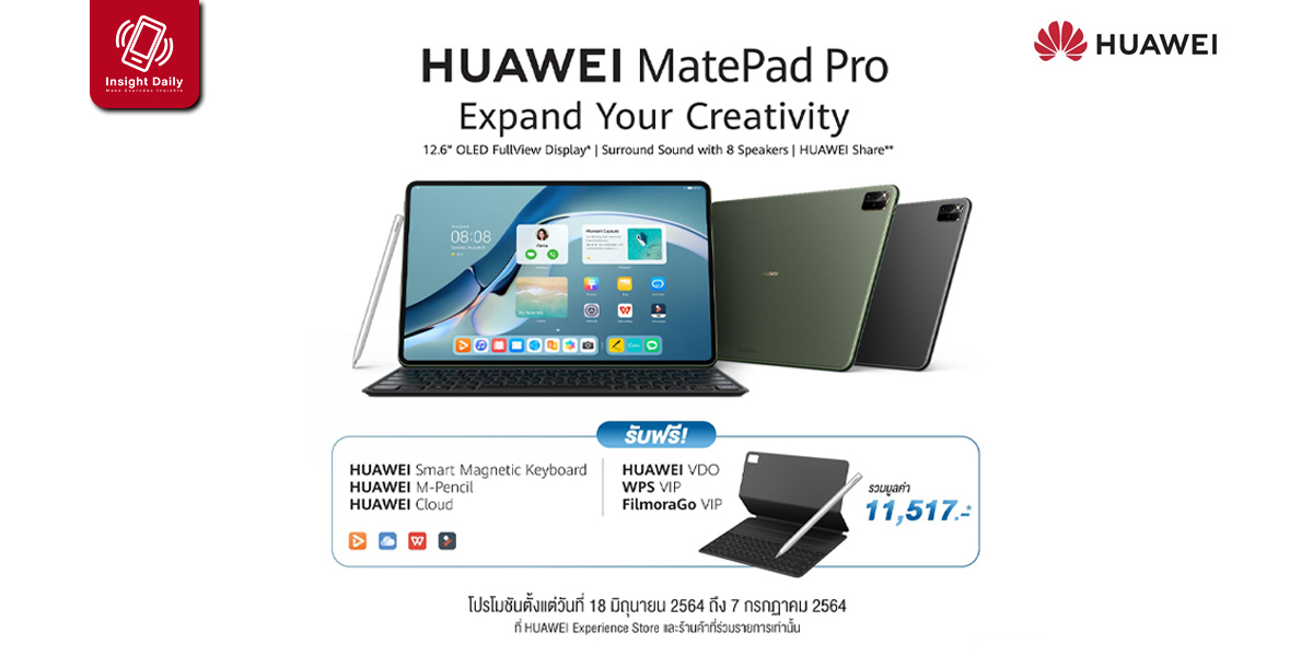 HUAWEI MatePad Pro 12.6-inch วางจำหน่ายแล้วในสี Matte Grey ราคา 28,990 บาท ออกสตาร์ทก่อน ได้เปรียบกว่า! เพราะเมื่อซื้อตั้งแต่วันที่ 18 มิถุนายน – 7 กรกฎาคม 2564 รับฟรีทันที HUAWEI Smart Magnetic Keyboard, HUAWEI M-Pencil, HUAWEI Cloud (200GB ระยะเวลา 3 เดือน), HUAWEI VDO (ระยะเวลา 1 เดือน), WPS VIP (ระยะเวลา 3 เดือน) และ FilmoraGo VIP (ระยะเวลา 3 เดือน) มูลค่ารวม 11,517 บาท ได้ที่ bit.ly/3vqJ0Wj รวมถึง HUAWEI Store, JD Central, Lazada, Shopee, HUAWEI Experience Store, และร้านค้าตัวแทนจำหน่ายอย่างเป็นทางการทั่วประเทศ เห็นของสมนาคุณพิเศษมากมายแบบนี้แล้วห้ามพลาดเด็ดขาด
