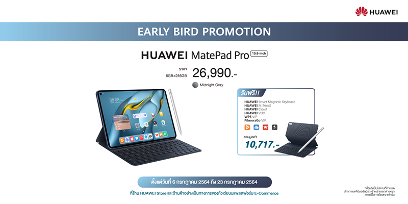 พร้อมน้องใหม่ HUAWEI MatePad Pro 10.8-inch สำหรับคนรักความคล่องตัวอีกระดับที่พร้อมให้คุณได้เป็นเจ้าของแล้วในราคา 26,990 บาท และเมื่อซื้อสินค้าตั้งแต่วันที่ 6 – 23 กรกฎาคม 2564 รับไปให้หนำใจกับ HUAWEI Smart Magnetic Keyboard, HUAWEI M-Pencil, HUAWEI Cloud (50GB ระยะเวลา 3 เดือน), HUAWEI VDO (ระยะเวลา 1 เดือน), WPS VIP (ระยะเวลา 3 เดือน) และ FilmoraGo VIP (ระยะเวลา 3 เดือน) มูลค่ารวม 10,717 บาท โดยสามารถสั่งซื้อผ่านช่องทางออนไลน์เท่านั้นที่ https://bit.ly/3hftfh2 HUAWEI Store และร้านค้าอย่างเป็นทางการของหัวเว่ยบนแพลตฟอร์ม E-Commerce อย่าง JD Central, Lazada, Shopee