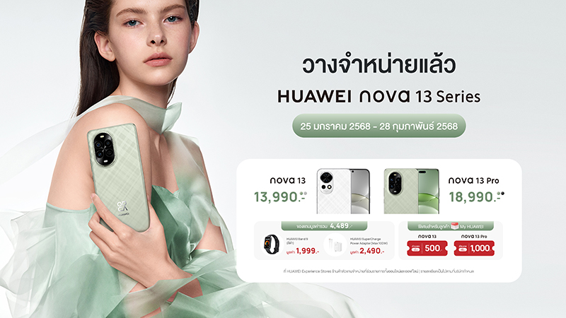 HUAWEI nova 13 Series วางจำหน่ายแล้วอย่างเป็นทางการในประเทศไทย HUAWEI nova 13 Pro มาพร้อม 2 สี ได้แก่ สีดำ และ สีเขียว วางจำหน่ายในราคา 18,990 บาท และ HUAWEI nova 13 มาพร้อม 2 สี ได้แก่ สีเขียว และสีขาว วางจำหน่ายในราคา 13,990 บาท โปรโมชันเมื่อสั่งซื้อตั้งแต่ 25 มกราคม – 28 กุมภาพันธ์ 2568 รับฟรี Band 9 (สีดำ) มูลค่า 1,990 บาท, 100W HUAWEI SuperCharge Power Adapter มูลค่า 2,490 บาท จับจองเป็นเจ้าของกันได้เลยที่ HUAWEI Experience Store และร้านค้าที่ร่วมรายการ รวมทั้งช่องทางออนไลน์ HUAWEI Store และร้านค้าอย่างเป็นทางการของหัวเว่ยบนแพลตฟอร์ม Lazada, Shopee และ TikTok Shop