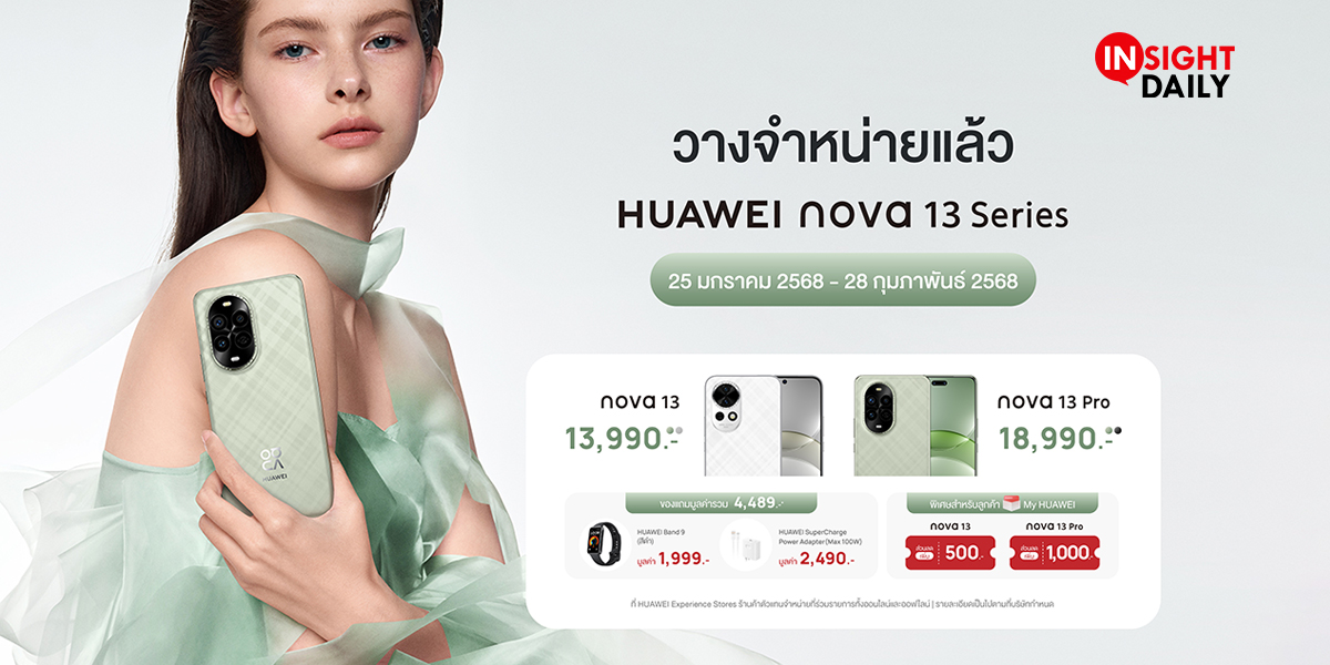 HUAWEI nova 13 Series วางจำหน่ายแล้วอย่างเป็นทางการในประเทศไทย HUAWEI nova 13 Pro มาพร้อม 2 สี ได้แก่ สีดำ และ สีเขียว วางจำหน่ายในราคา 18,990 บาท และ HUAWEI nova 13 มาพร้อม 2 สี ได้แก่ สีเขียว และสีขาว วางจำหน่ายในราคา 13,990 บาท โปรโมชันเมื่อสั่งซื้อตั้งแต่ 25 มกราคม – 28 กุมภาพันธ์ 2568 รับฟรี Band 9 (สีดำ) มูลค่า 1,990 บาท, 100W HUAWEI SuperCharge Power Adapter มูลค่า 2,490 บาท จับจองเป็นเจ้าของกันได้เลยที่ HUAWEI Experience Store และร้านค้าที่ร่วมรายการ รวมทั้งช่องทางออนไลน์ HUAWEI Store และร้านค้าอย่างเป็นทางการของหัวเว่ยบนแพลตฟอร์ม Lazada, Shopee และ TikTok Shop