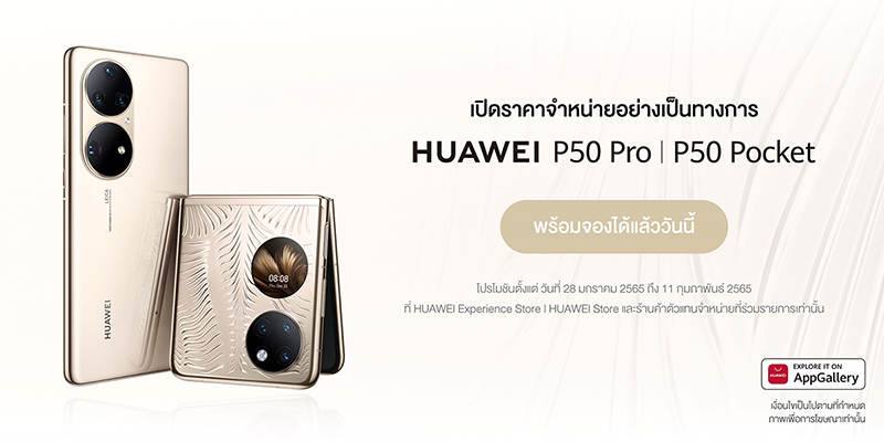หัวเว่ย คอนซูมเมอร์ บิสสิเนส กรุ๊ป (ประเทศไทย) ประกาศเปิดตัว HUAWEI P50 Pro ที่กลับมาทวงบัลลังก์สมาร์ทโฟนแห่งการถ่ายภาพระดับตำนาน พร้อมการสานต่อความร่วมมือกับ Leica เปิดการเดินทางบทใหม่ของกล้องสมาร์ทโฟน สุนทรียะแห่งดีไซน์ และประสบการณ์รอบด้าน พร้อม HUAWEI P50 Pocket สมาร์ทโฟนจอพับรุ่นใหม่ล่าสุดที่เป็นอีกก้าวสำคัญของการผสานความงามและเทคโนโลยี รวมถึงการถ่ายภาพที่อัจฉริยะไว้อย่างลงตัว เปิดราคาจำหน่ายในประเทศไทยอย่างเป็นทางการเริ่มต้นกับ HUAWEI P50 Pro ที่ 33,990 บาท และ HUAWEI P50 Pocket ราคาเริ่มต้นที่ 46,990 บาท เปิดให้จับจองเป็นเจ้าของพร้อมโปรโมชันสุดคุ้มก่อนใครได้แล้วตั้งแต่วันที่ 28 มกราคม 2565 ถึง 11 กุมภาพันธ์ 2565