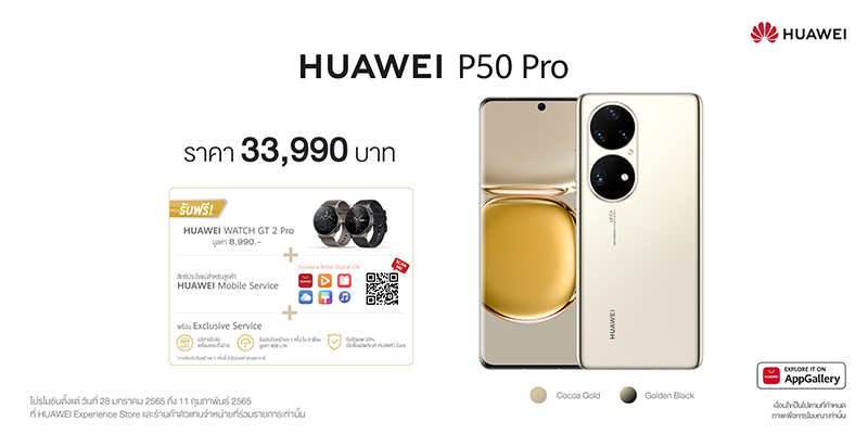 HUAWEI P50 Pro วางจำหน่ายในประเทศไทยที่ราคา 33,990 บาท มีให้เลือกทั้งสีทอง Cocoa Gold และสีดำทอง Golden Black พร้อมโปรโมชันพรีออเดอร์สุดคุ้มเมื่อจองสินค้าที่ HUAWEI Experience Store และร้านค้าตัวแทนจำหน่ายที่ร่วมรายการ พิเศษ! สำหรับลูกค้า AIS และ TrueMove H เป็นเจ้าของ HUAWEI P50 Pro ได้ในราคาเริ่มต้น 9,990 บาท เมื่อชำระค่าบริการตามเงื่อนไขที่ผู้ให้บริการกำหนด โดยสามารถพรีออเดอร์ได้ระหว่างวันที่ 28 มกราคม 2565 ถึง 11 กุมภาพันธ์ 2565 รับฟรี HUAWEI WATCH GT 2 Pro มูลค่า 8,990 บาท พร้อมฟรีแพ็กเกจ HUAWEI Video plus VIP 1 เดือน และฟรี HUAWEI Video Movie Pass 2 ใบ รวมมูลค่า 200 บาท, ฟรีคูปอง HUAWEI Themes 3 เดือน มูลค่า 149 บาท, ฟรีพื้นที่จัดเก็บข้อมูล HUAWEI Mobile Cloud storage 2TB ระยะเวลา 1 เดือน มูลค่า 349 บาท พร้อมบริการหลังการขายที่จะทำให้ลูกค้าหมดกังวล โดยมอบความคุ้มครองพิเศษ ได้แก่ บริการรับส่งเครื่องซ่อมถึงบ้าน, รับประกันหน้าจอ 1 ครั้งในระยะเวลา 3 เดือน มูลค่า 499 บาท (ไม่รวมค่าแรงและภาษี) และรับทันทีส่วนลด 20% เมื่อซื้อผลิตภัณฑ์ HUAWEI Care