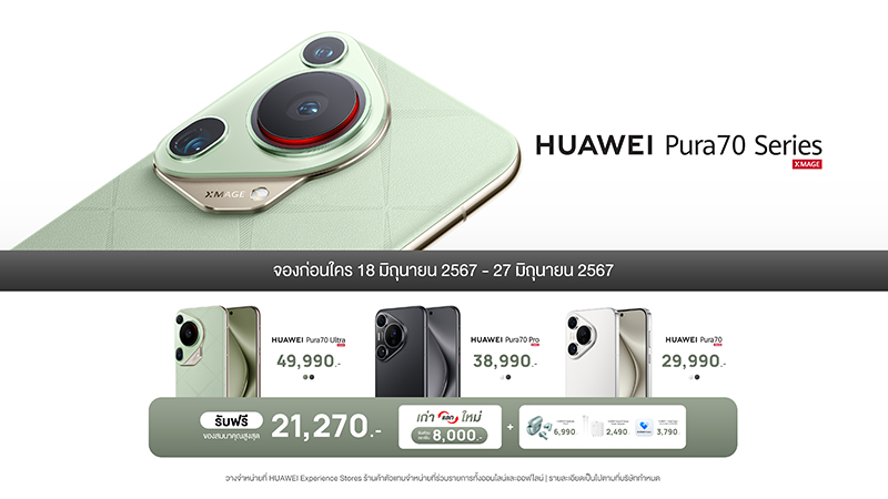 HUAWEI Pura 70 มีให้เลือก 2 สี ได้แก่ สีขาว และ สีดำ วางจำหน่ายในราคา 29,990 บาท พร้อมรับฟรี HUAWEI FreeBuds Pro 3 มูลค่า 6,990 บาท HUAWEI SuperCharge Power Adapter 66W มูลค่า 1,690 บาท และ HUAWEI 1-Year Care มูลค่า 2,290 บาท