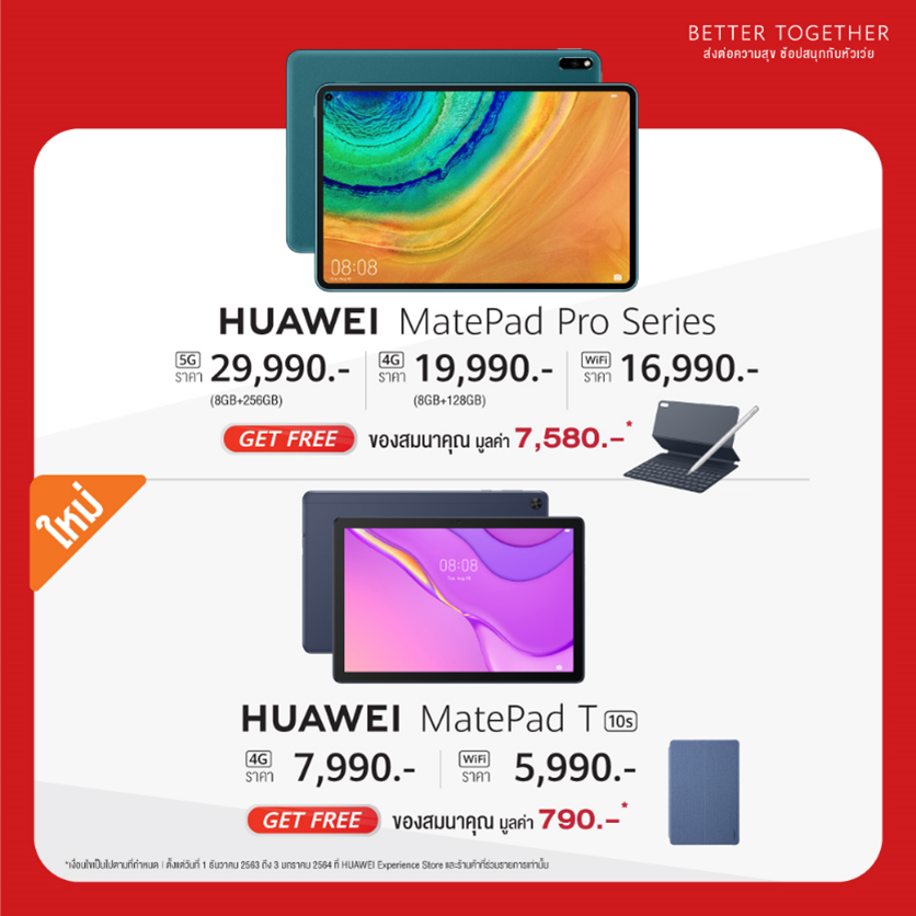 HUAWEI MatePad Pro 5G ครบเครื่องเรื่องความบันเทิงทั้ง หน้าจอเต็มตา FullView Display ขนาด 10.8 นิ้ว ความละเอียดเต็มสตรีมระดับ 2560 x 1600 พิกเซล ควบคู่ระบบเสียงรอบทิศทาง คุณภาพระดับโรงหนังขนาดย่อส่วนด้วยลำโพง 4 จุด ซึ่งรับรองโดย Harman Kardon แถมแบตอึดเล่นวิดีโอได้นานติดต่อกันถึง 12 ชั่วโมง รับรองว่าคุณได้ วาร์ปข้ามปีไปแบบครบรสกันเลยทีเดียว โดย HUAWEI MatePad Pro 5G มาในราคา 29,990 บาท ขณะที่ HUAWEI MatePad Pro (4G) ราคา 19,990 บาท และ HUAWEI MatePad Pro (WiFi) ราคา 16,990 บาท พร้อมรับของขวัญสุดพิเศษ ได้แก่ HUAWEI Magnetic Keyboard และ M Pen ไปใช้ร่วมกันทันที มูลค่ารวม 7,580 บาท ซัพพอร์ตทุกกิจกรรมในวันว่างกับแท็บเล็ตเพื่อความบันเทิง เพื่อนคู่ใจ ไปไหนไปกัน ช่วงเวลาสำคัญทั้งที การมีเพื่อนซี้คู่ใจ ที่ช่วยเอนเตอร์เทนยามเหงาในวันว่าง หรือช่วยทำงานก็ยังได้ คงเป็นอีกหนึ่งของขวัญชิ้นเยี่ยมที่ใครก็อยากหามาให้ตัวเองสำหรับปีใหม่ที่กำลังจะมาถึง ต้องนี่เลย! เพื่อนซี้คนสำคัญที่จะช่วยเปลี่ยนความเหงาให้จางหายไป และเติมเต็มความสุขให้กับตัวเองได้ เพียงแค่ลงทุนไม่มาก แต่ก็รับรองว่าได้ความสนุกครบครันเลยทีเดียวกับ
