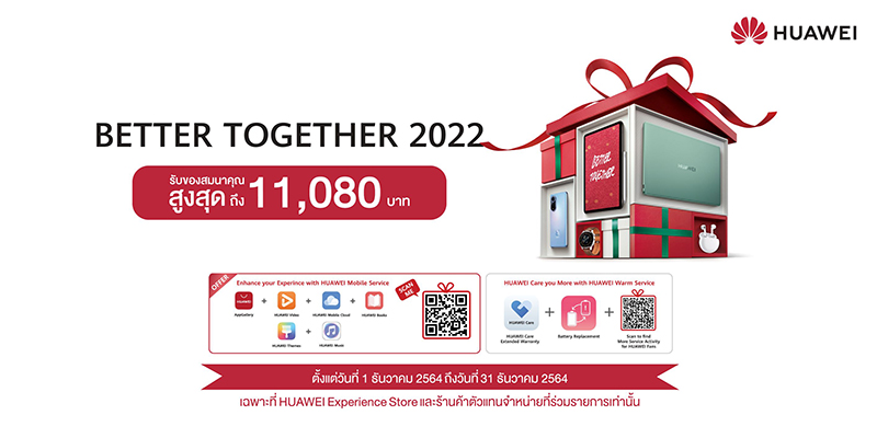 พร้อมกันนี้ หัวเว่ยยังมอบข้อเสนอสุดคุ้มเป็นของขวัญแทนคำขอบคุณให้กับลูกค้า กับแคมเปญโปรโมชัน Better Together 2022 จัดเต็มของสมนาคุณรวมมูลค่าสูงสุด 11,080 บาท พร้อมส่วนลดสุดพิเศษสำหรับผลิตภัณฑ์ชั้นนำอีกมากมาย สำหรับผู้ที่ซื้อสินค้าที่ร้าน HUAWEI Experience Store และร้านค้าตัวแทนจำหน่ายที่ร่วมรายการทั่วประเทศ ตั้งแต่วันที่ 1 ธันวาคม 2564 ถึง 31 ธันวาคม 2564 ครอบคลุมไอเท็มเด็ดๆ จากหลากหลายกลุ่มสินค้า อาทิ สมาร์ทโฟนที่มาพร้อมกล้องเทพคุณภาพระดับเรือธงรุ่นล่าสุด HUAWEI nova 9 ราคาเพียง 16,990 บาท รับทันทีหูฟัง HUAWEI FreeBuds Pro มูลค่า 5,499 บาท HUAWEI MateBook 14s แล็ปท็อปอัจฉริยะระดับ Hi-End ที่มาพร้อมหน้าจอทัชสกรีน HUAWEI FullView Display 2.5K ขนาด 14.2 นิ้ว ราคาเริ่มต้นที่ 40,990 บาท รับไปเลยหูฟังไร้สาย HUAWEI FreeBuds Pro มูลค่า 5,499 บาท และ HUAWEI MateBook D Series แล็ปท็อปที่ตอบโจทย์ไลฟ์สไตล์ของคนเจนใหม่ กับหน้าจอใหญ่เต็มตา ขุมพลัง 11th Gen Intel® Core™ เร็วแรง และรองรับ Multi-screen Collaboration ที่พร้อมให้คุณเป็นเจ้าของได้ในราคาที่ต้องได้ และอื่นๆ อีกมากมาย