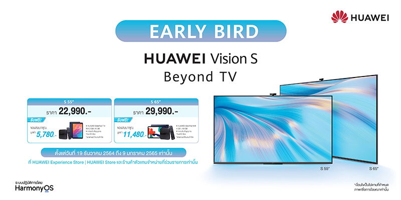 - เมื่อซื้อ HUAWEI Vision S กับ AIS ตั้งแต่วันที่ 19 ธันวาคม 2564 – 31 ธันวาคม 2564 สำหรับ HUAWEI Vision S ขนาด 55 นิ้ว ราคาเริ่มต้นเพียง 1 บาท เมื่อสมัครแพ็กเกจรายเดือน 1,199 บาทขึ้นไปและชำระค่าบริการล่วงหน้า 6 เดือน ระยะสัญญา 12 เดือนรับฟรี HUAWEI MatePad T8 WiFi มูลค่า 3,290 บาท สำหรับ HUAWEI Vision S ขนาด 65 นิ้ว เริ่มต้น 9,990 บาท เมื่อสมัครแพ็กเกจรายเดือน 1,199 บาทขึ้นไปและชำระค่าบริการล่วงหน้า 6 เดือน ระยะสัญญา 12 เดือนรับฟรี HUAWEI MatePad 10.4 WiFi มูลค่า 8,990 บาท สินค้าและของแถมมีจำนวนจำกัด เมื่อซื้อ HUAWEI Vision S พร้อมเปิดเบอร์ใหม่รายเดือนและสมัครแพ็กเกจ ที่ AIS Shop สาขาที่ร่วมรายการ โดยตามเงื่อนไขเป็นไปตามที่ AIS กำหนด ดูรายละเอียดเพิ่มเติมได้ที่ www.ais.th/huawei-vision-s