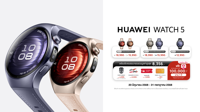 พร้อมข้อเสนอรับของสมนาคุณรวมมูลค่าสูงสุด 8,356 บาท ตั้งแต่วันที่ 20 มิถุนายน – 31 กรกฏาคม 2568 ประกอบด้วย HUAWEI FreeBuds 5 ราคา 4,999 บาท (จำกัดเพียง 1,000 คำสั่งซื้อแรกเท่านั้น) สิทธิ์เก่าแลกใหม่และรับส่วนลดเพิ่มจากราคาประเมินมูลค่า 2,000 บาท My HUAWEI Voucher ส่วนลดค่าเครื่อง มูลค่า 1,000 บาท และ HUAWEI Health+ Membership มูลค่า 357 บาท (3 เดือน) และสิทธิ์ที่แอป Alive ฟรี ประกันกลุ่มจาก AIA มูลค่า 100,000 บาท นาน 1 ปี สิทธิ์มีจำนวนจำกัด ลงทะเบียนรับสิทธิ์ตั้งแต่ 20 มิถุนายน – 31 กรกฎาคม 2568