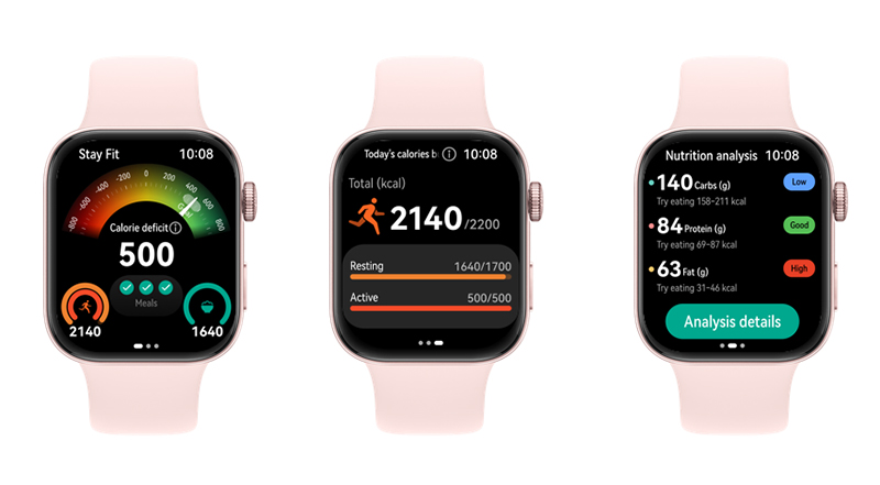 ด้วยการใช้วิธีการคํานวณขั้นสูงซึ่งพัฒนาขึ้นโดยหัวเว่ย สมาร์ทวอทช์จะคํานึงถึงปริมาณแคลอรี่ของคุณตามข้อมูลที่ผู้ใช้ป้อนในแอป HUAWEI Health โดยซิงข้อมูลสารอาหาร เช่น คาร์โบไฮเดรต ไขมันและโปรตีนสําหรับการวิเคราะห์สารอาหาร นอกเหนือจากข้อมูลสุขภาพแบบเรียลไทม์ที่นํามาจากสมาร์ทวอทช์ของคุณแล้ว แอปจะให้ข้อมูลที่เชื่อถือได้เพื่อเป็นแนวทางในการเลือกรับประทานอาหารของคุณ สิ่งนี้ช่วยให้ผู้ใช้เข้าใจพฤติกรรมการบริโภคแคลอรี่ของตนได้ดีขึ้น และกระตุ้นให้ผู้ใช้สร้างความสมดุลระหว่างการควบคุมอาหารและการออกกําลังกาย ทําให้ผู้ใช้สามารถบรรลุความก้าวหน้าใหม่ ๆ ในเส้นทางการควบคุมน้ำหนักได้ นอกจากนี้ ผู้ใช้ยังสามารถเปิดใช้งานหน้าปัดสมาร์ทวอทช์แบบพิเศษของ Stay Fit ซึ่งช่วยให้ผู้ใช้สามารถติดตามปริมาณแคลอรี่ที่ได้รับจากเพียงแวบเดียว ซึ่งทําหน้าที่เป็นตัวเตือนความจําที่สม่ําเสมอตลอดทั้งวัน