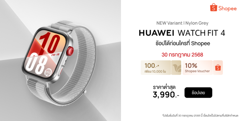 กระแสตอบรับดีเกินคาด! HUAWEI WATCH FIT 4 ได้รับความนิยมอย่างล้นหลามจากดีไซน์ล้ำ ฟีเจอร์ครบ และน้ำหนักเบา ล่าสุดเปิดตัว HUAWEI WATCH FIT 4 สีเทาใหม่! ที่มาพร้อมสายถัก 3D Nylon สีเทา กับฟีเจอร์สุขภาพและฟิตเนสแน่นๆ แบบจัดเต็ม วางจำหน่ายแบบเอ็กซ์คลูซีฟเฉพาะที่ Shopee เท่านั้น! เพียง 3,990 บาท จากปกติ 4,990 บาท