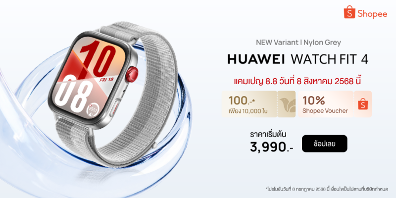เตรียมกดให้ไว! HUAWEI ส่งดีลเด็ดรับแคมเปญใหญ่กลางปี Shopee 8.8 Super Brand Day กับการเปิดตัว HUAWEI WATCH FIT 4 รุ่นใหม่ สี Nylon Grey พร้อมโปรสุดคุ้มที่สายช้อปห้ามพลาด วันที่ 8 สิงหาคม 2568 วันเดียวเท่านั้น
