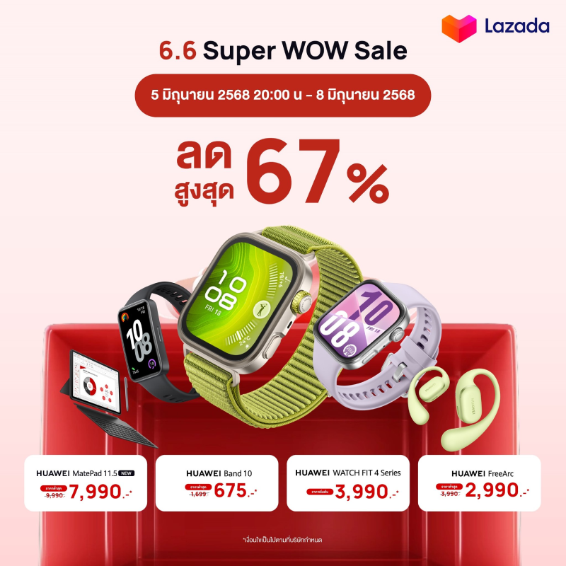 พิเศษ! เฉพาะแคมเปญ Lazada 6.6 นี้ นอกจาก HUAWEI WATCH FIT 4 Series ยังมีอุปกรณ์หัวเว่ยทั้งร้านลดสูงสุดถึง 67% พร้อมคูปองลดเพิ่มอีกสูงสุด 20% ห้ามพลาดโอกาสดีๆ แบบนี้ รีบกดก่อนของหมด! ที่ Lazada เท่านั้น เลือกให้ตรงไลฟ์สไตล์ แล้วไปกดดีลสุดคุ้มนี้ได้เลย