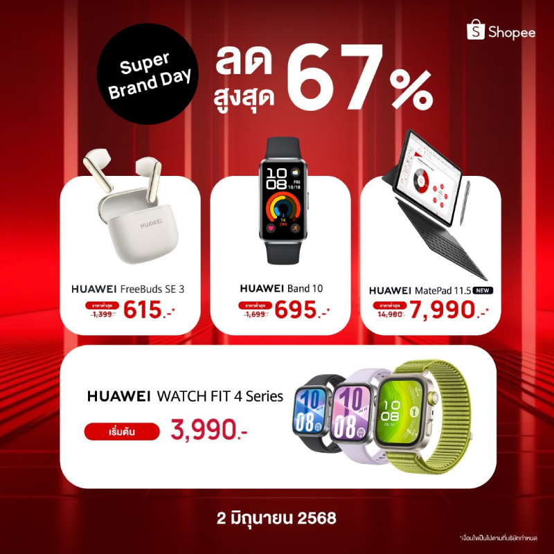อยากเริ่มดูแลตัวเองให้เป็นระบบมากขึ้น ลองให้เทคโนโลยีช่วยได้บ้าง ทั้งสุขภาพ การนอน การออกกำลังกาย ครบจบในเรือนเดียว ในแบบที่ไม่จำเป็นต้องจ่ายแพงเสมอไป เพราะวันที่ 2 มิถุนายน 2568 วันเดียวเท่านั้น เตรียมพบกับโปรโมชัน Shopee Super Brand Day กับ HUAWEI WATCH FIT 4 Series ที่ให้คุณได้มากกว่าแค่ “สมาร์ทวอทช์”