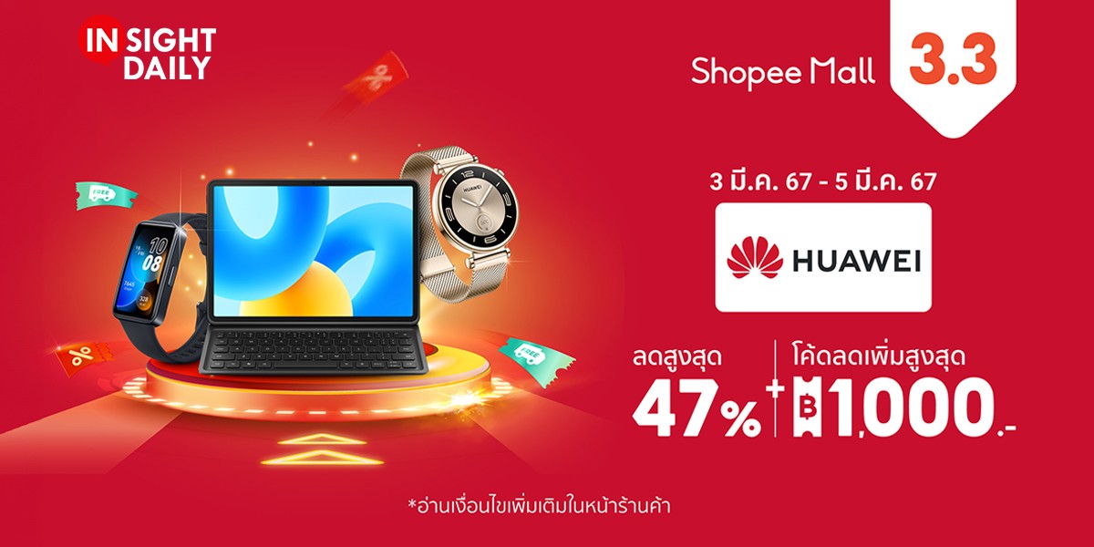 หัวเว่ย คอนซูมเมอร์ บิสสิเนส กรุ๊ป (ประเทศไทย) ร่วมจับมือ ช้อปปี้ อีคอมเมิร์ซเบอร์ 1 [1] ครองใจนักช้อปชาวไทย ส่งโปรโมชั่นเปิดดีลลดใหญ่ รับมหกรรมเทศกาลช้อปปิ้งออนไลน์ครั้งแรกของปีในแคมเปญ Shopee 3.3 ลดใหญ่ต้นปี ส่งมอบส่วนลดเกินต้าน ลดสูงสุดกว่า 47% เมื่อสั่งซื้อสินค้าผ่านร้านค้า Huawei Official Store บน Shopee ตั้งแต่วันที่ 3 – 5 มีนาคม 2567 มาดูกันเลยดีกว่าว่ามีอะไรน่าช้อปบ้าง