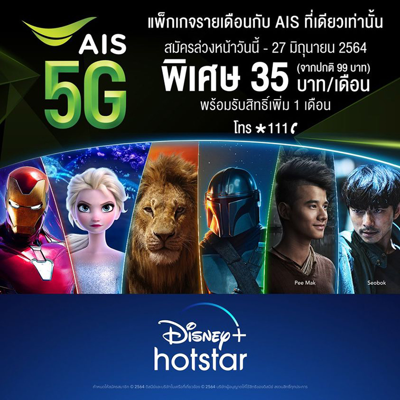 ดิสนีย์พลัส ฮอตสตาร์ (Disney+ Hotstar) บริการสตรีมมิ่งที่ทุกคนรอคอยพร้อมแล้วที่จะสร้างความบันเทิงให้ทุกคนด้วยภาพยนตร์กว่า 700 เรื่องและซีรีส์ดังอีกกว่า 14,000 ตอนจากทั่วโลก เอเชีย และไทย คับคั่งด้วยภาพยนตร์และซีรีส์ฟอร์มยักษ์ระดับบล็อกบัสเตอร์จากมาร์เวล ดิสนีย์เรื่องโปรด (Disney Favourites) ดิสนีย์พลัส ออริจินัลส์ (Disney+ Originals) พร้อมเรื่องราวจากเอเชีย+ไทย (Asian+Thai Stories) อีกมากมาย สมัครสมาชิกได้แล้ววันนี้ทางเว็บไซต์หรือแอปพลิเคชัน Disney+ Hotstar ในราคา 799 บาทต่อปี หรือสมัครพร้อมแพ็กเกจพิเศษจาก AIS 5G